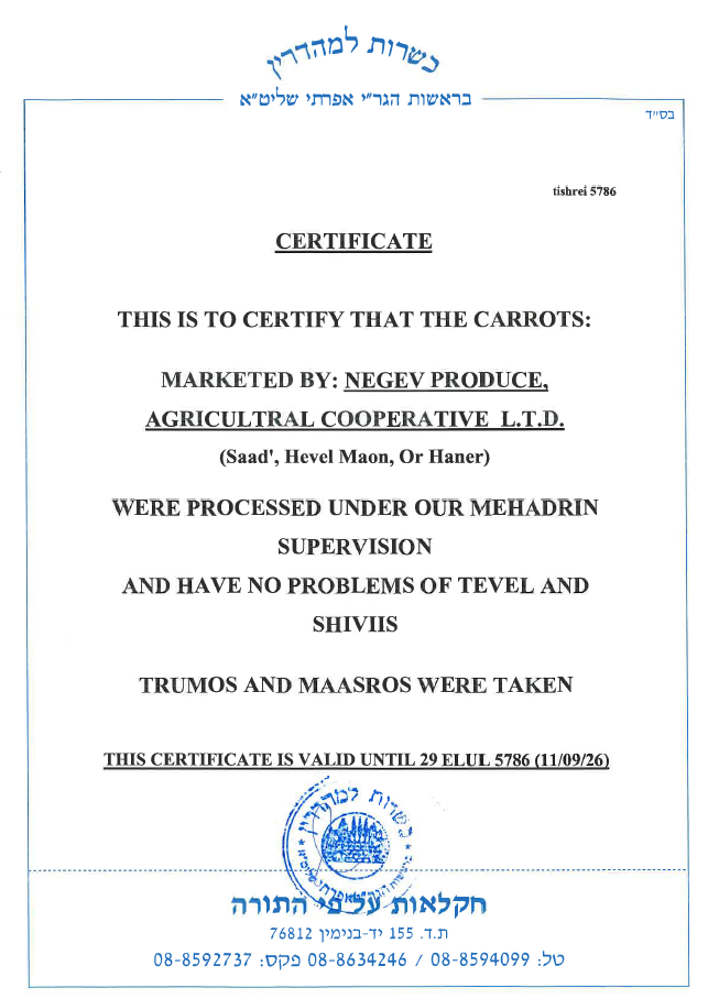 תעודת כשרות לכל הפירות והירקות של תוצרת הנגב ניתנה ע"י "חקלאות עפ"י התורה"